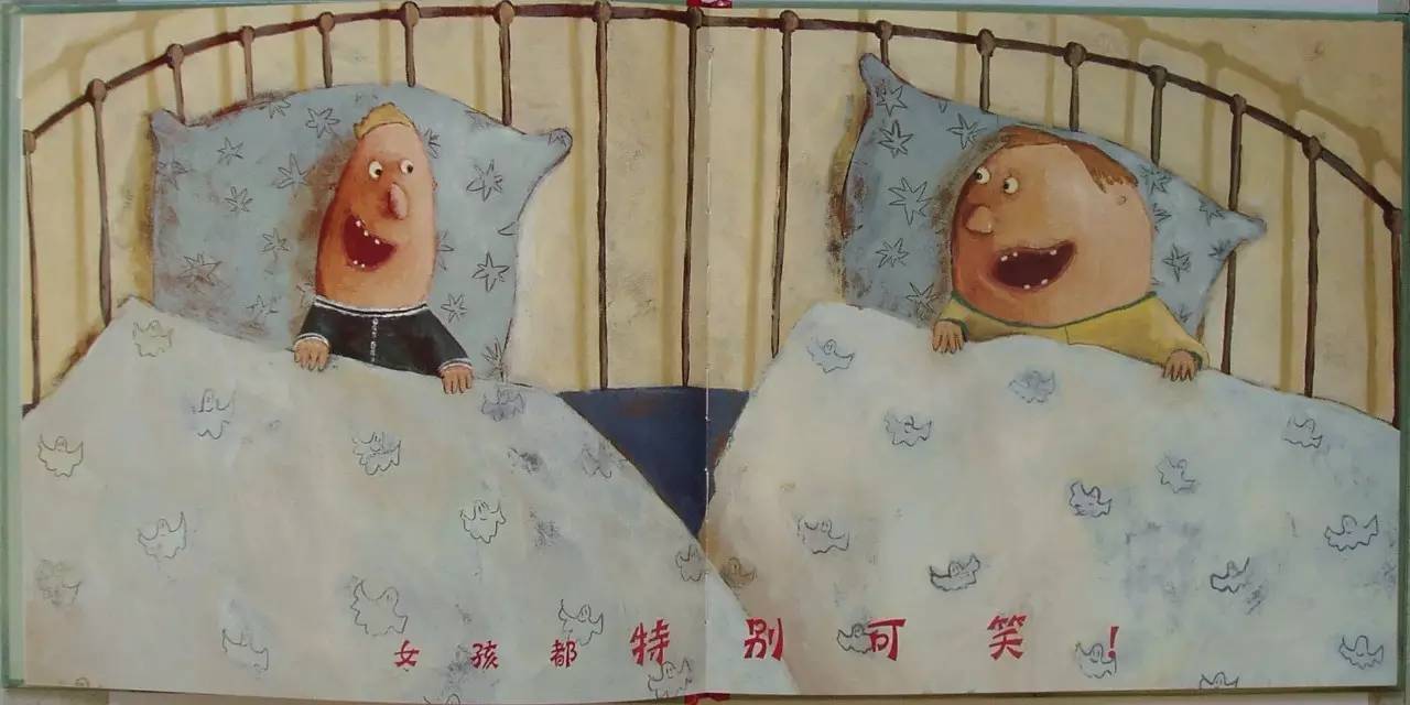 晚上,两个小男孩不好好睡觉,在床上不断地拿女孩取笑。他们嘲笑女孩无趣、胆小:女孩一天到晚只会给布娃娃梳头,不停地帮布娃娃换衣服;她们胆小如鼠,夜里怕到会尿床,只有抱着一堆玩具熊才能入睡;此外,她们还怕鬼。可聊着聊着,两个小男孩自己也害怕了,最后他们和小女孩一样抱着玩具熊入睡了。