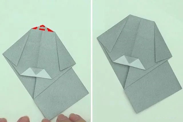 11、两个耳朵之间的三角形(红色虚线所示范围)向后折叠。