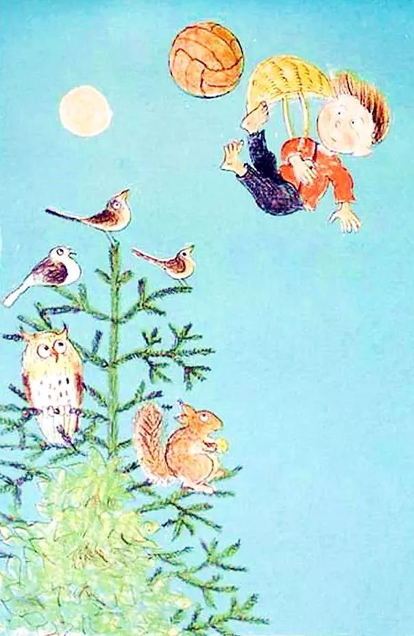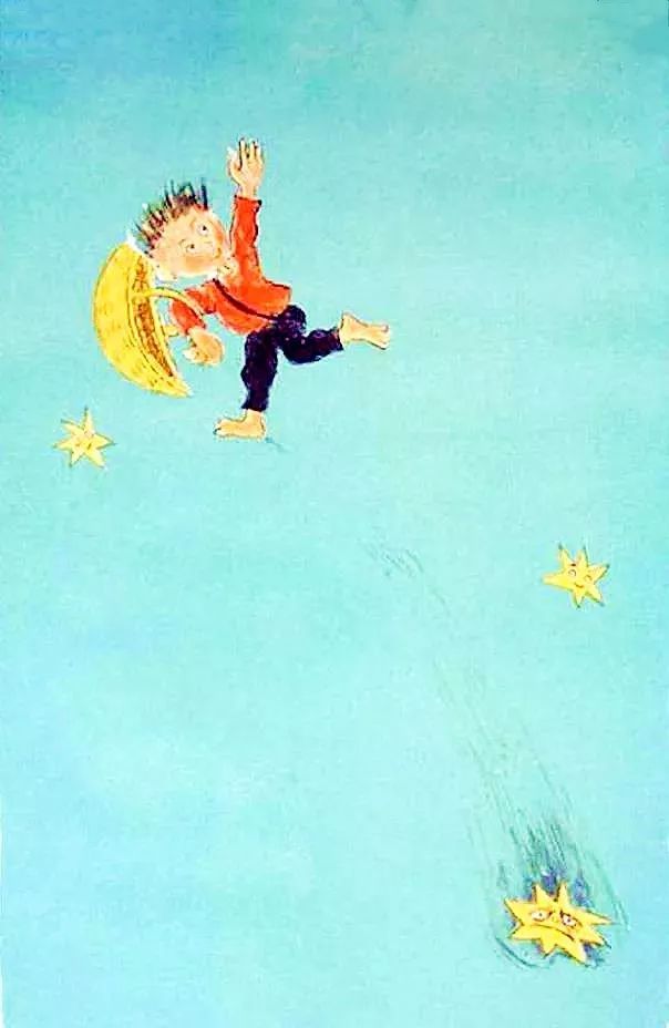 月光男孩为了给月亮寻找另外一个月亮,拎着篮子出发了。他落啊落啊,从天上落了下来,先是穿云而过,然后是飞机、一大群候鸟、风筝、气球、站在梯子上采苹果的小女孩、打扫烟囱的黑脸男人、红砖房、街道,最后“扑通”一声落到了水里…