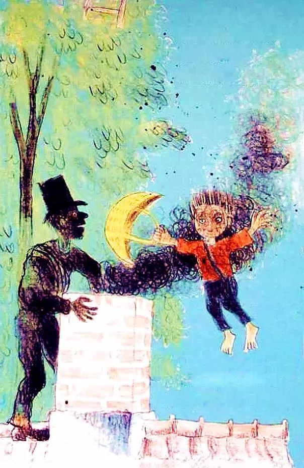 当他来到烟囱顶上的时候,他的脸,都被烟熏黑了。