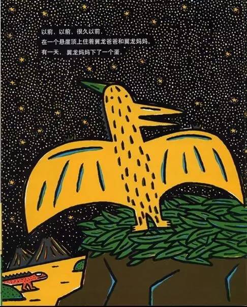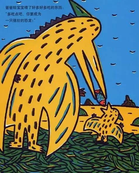 爸爸教他怎么飞行:“你好好听着,拼命地张开翅膀,用力踢打地面,乘着风就行啦!只要你飞得高,就算遇到粗暴的可怕的霸王龙,也用不着害怕。”