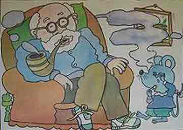 老爷爷有个心爱的烟斗,他老是用它抽烟。老爷爷“吱—吱—“地吸,再”呼—“地吐出来,房子里都是烟雾。住在老爷爷俩里家里的小老鼠,也被呛出了眼泪。