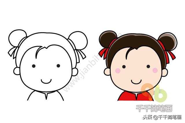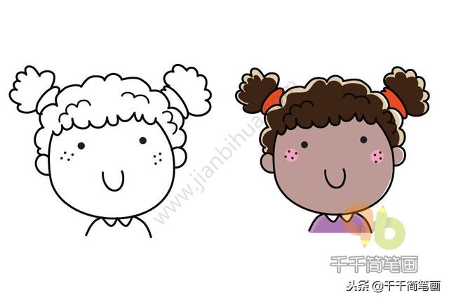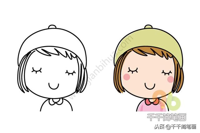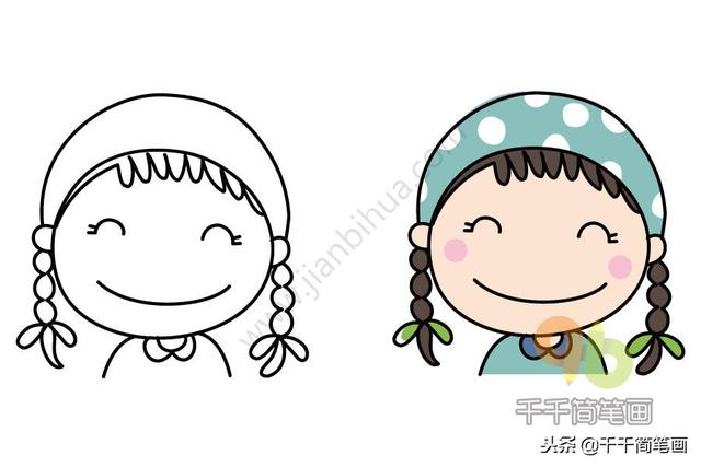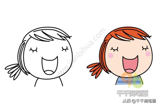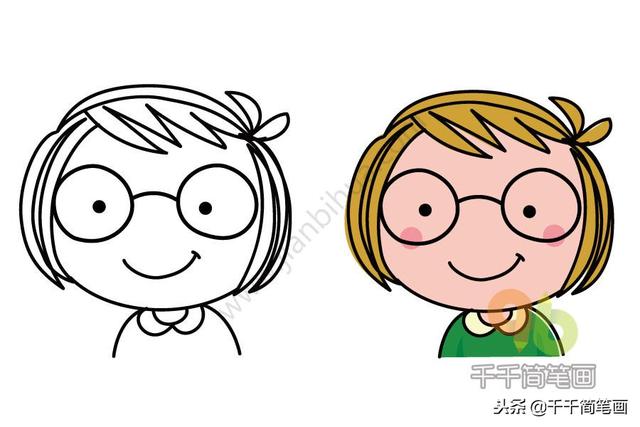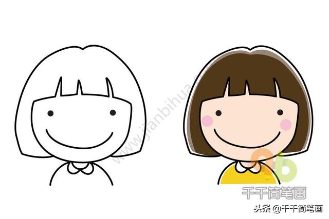 [简笔画大全]首先画出女孩的头发和刘海,脸型圆圆的,画出她的五官,再来画出衣服,一只手背在身后,画出裙子的褶皱纹理,给女孩的头发涂深棕色,面部涂肤色,上衣涂浅青色,裙子涂玫红色,简单