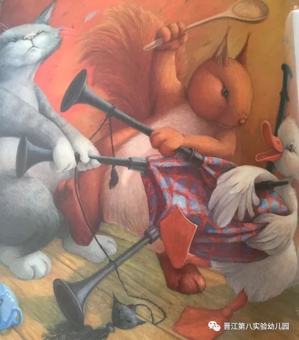 可是有一天鸭子拿着松鼠专属的汤勺想搅汤,于是麻烦来了,古老的小白屋里充满了激烈的争吵、吼叫和混乱……鸭子出走了。他把行李装进手推车,戴上帽了,摇摇摆摆地离开了。猫对着鸭子的背影生气地吼着:“你会回来的。”松鼠在窗户里握着他的汤勺在空中挥来挥去。