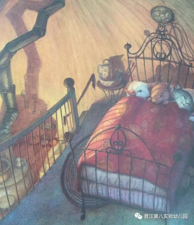 他们一起喝汤、一起弹琴唱歌,然后一起跳上床,钻进被子。