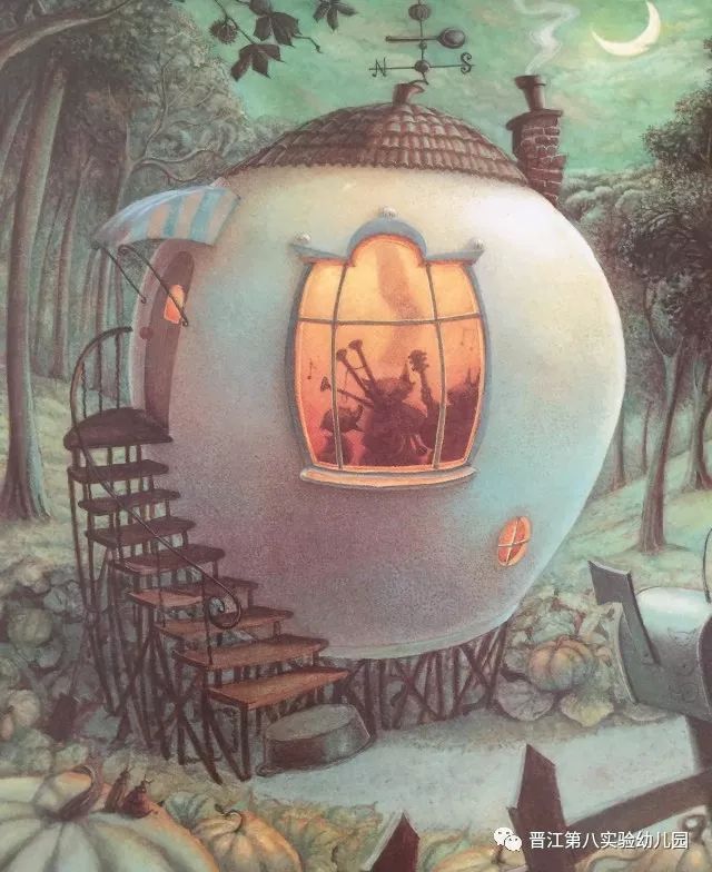 树林里有一间古老的小白屋,园子里种了很多南瓜。那里有闻起来好香的汤。到了晚上,如果你够幸运的话,或许可以透过窗户看见一只猫在吹风笛、一只松鼠在弹斑鸠琴、一只小鸭子在唱歌。