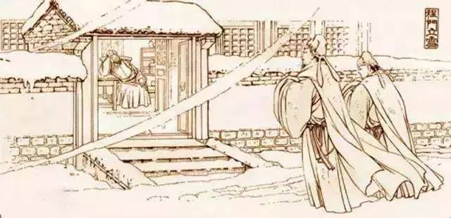 北宋大学问家杨时,在40多岁时与好友游酢一起去向程颐求教,凑巧赶上程颐在屋中打盹儿。杨时便劝告游酢不要惊醒老师,于是两人静立门口,等老师醒来。一会儿下起了鹅毛大雪,越下越急,杨时和游酢却还立在雪中,游酢实在冻得受不了,几次想叫醒程颐,都被杨时拦住了。程颐一觉醒来,才发现门外的两个“雪人”。