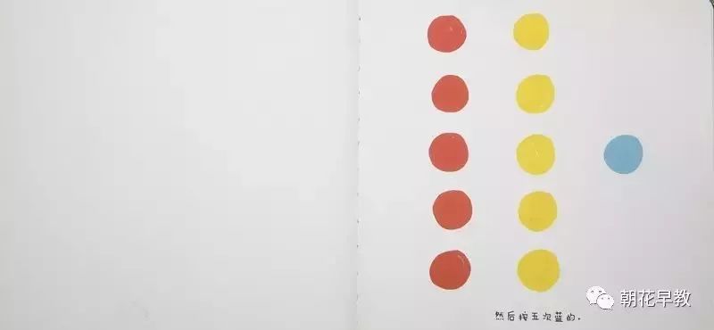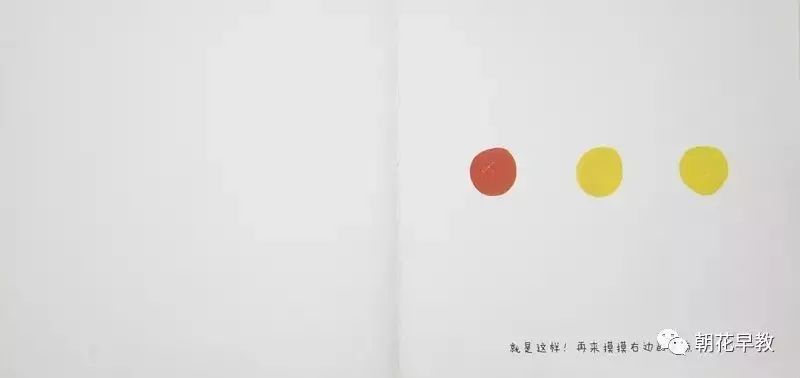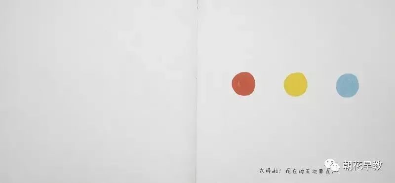 翻开第一页的时候,整页只有一个黄点和简单的操作指令,“按一下这个黄点,翻到下一页。”,翻开第二页,就会惊奇的发现变成了两个黄点;“很好!再按一下。”翻到第三页时,黄点点的数量就又增加了一个;“非常棒!现在用手指轻轻的摸摸左点的黄点”,打开第四页你就会发现被你摸过的点点变颜色了……
