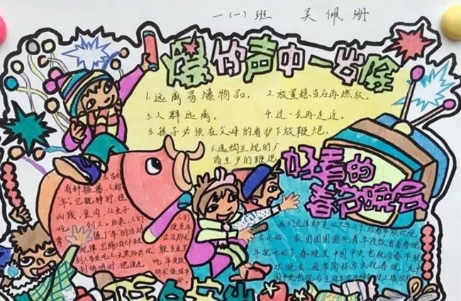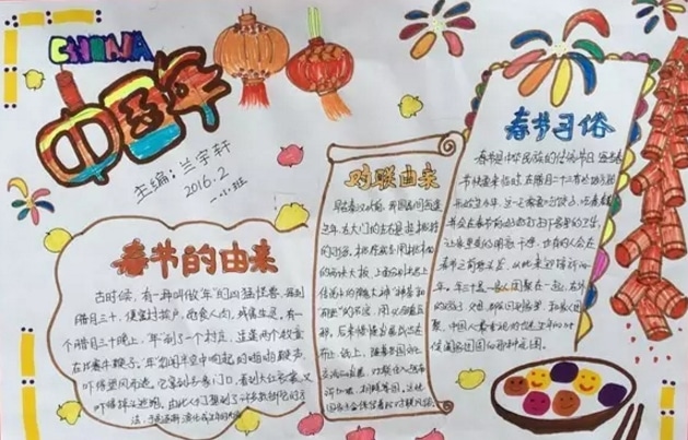 [手抄报]先在中间画上报头文字,加上一个卷轴边框,上面画一个提着一串鞭炮的小姑娘,底部画上祥云,上边画上两个灯笼,给中间加一个圆形边框,补充其它装饰,接下来涂上颜色,最后画上整齐
