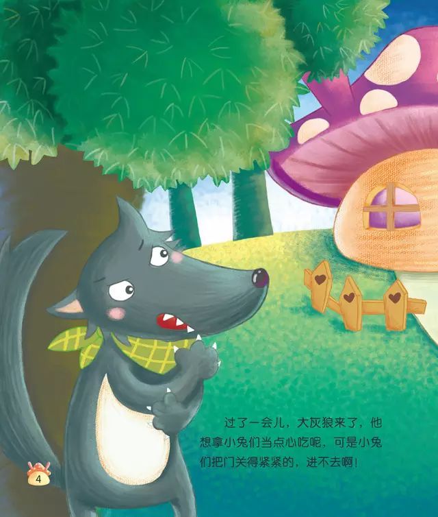 第二天,兔妈妈到树林里去采蘑菇,小兔们把门关得紧紧的。过了一会儿,大灰狼又来了,一边敲门,一边用那又粗又哑的声音唱歌。“小兔乖乖,把门儿开开,快点儿开开,我要进来。”