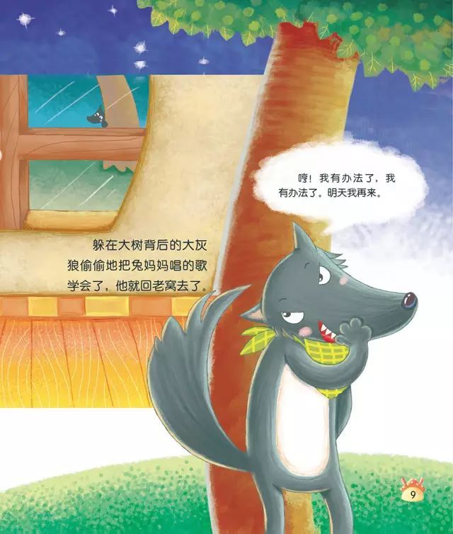 躲在大树背后的大灰狼偷偷地把兔妈妈唱的歌学会了,他就回老窝去了。“哼!我有办法了,我有办法了,我有办法了,明天我再来。”