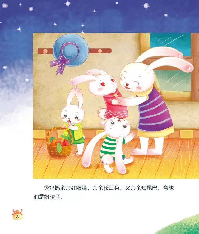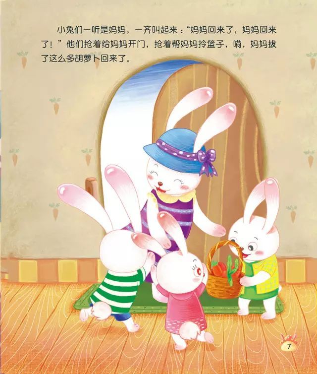 小兔们一听是妈妈,一齐叫起来:“妈妈回来了,妈妈回来了!”他们抢着给妈妈开门,抢着帮妈妈拎篮子,嗬,妈妈拔了这么多萝卜回来了。