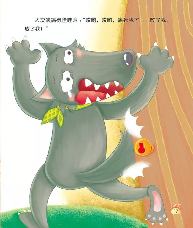 大灰狼痛得哇哇叫:“哎呦,哎呦,痛死我了……放了我,放了我!”