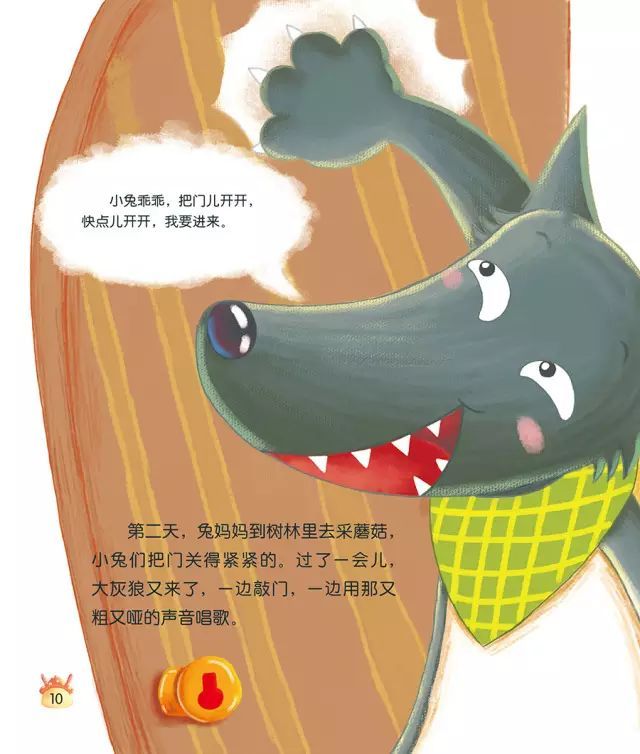 长耳朵一听,拉住红眼睛和短尾巴说:“不对,不对!这不是妈妈的声音。”红眼睛和短尾巴往门缝里一看:“不对,不对,不是妈妈,是大灰狼。”