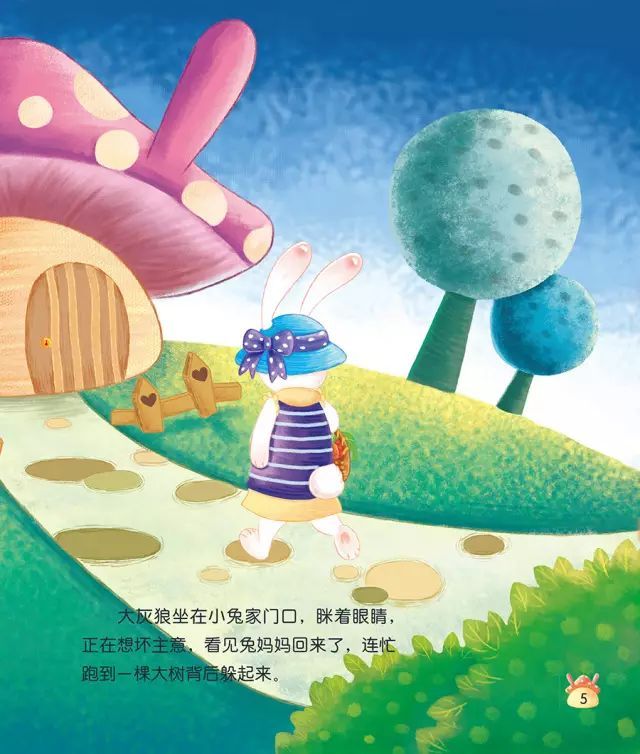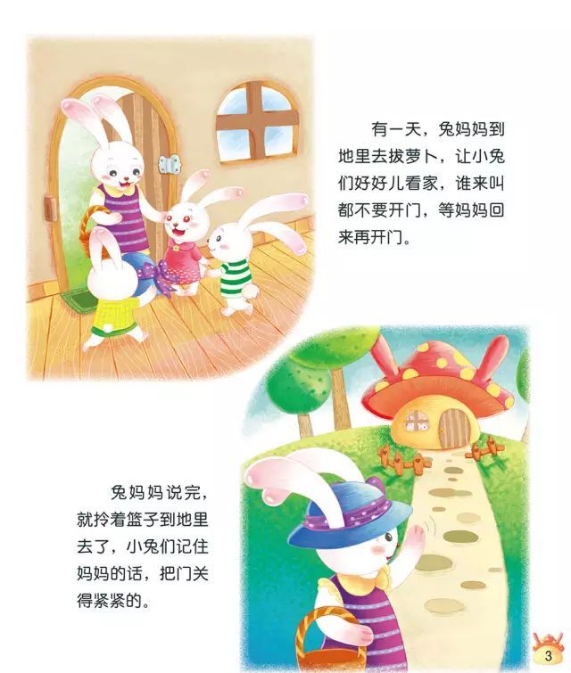 有一天,兔妈妈到地里去拔萝卜,让小兔们好好儿看家,谁来叫都不要开门,等妈妈回来再开门。兔妈妈说完,就拎着篮子到地里去了,小兔们记住妈妈的话,把门关得紧紧的。