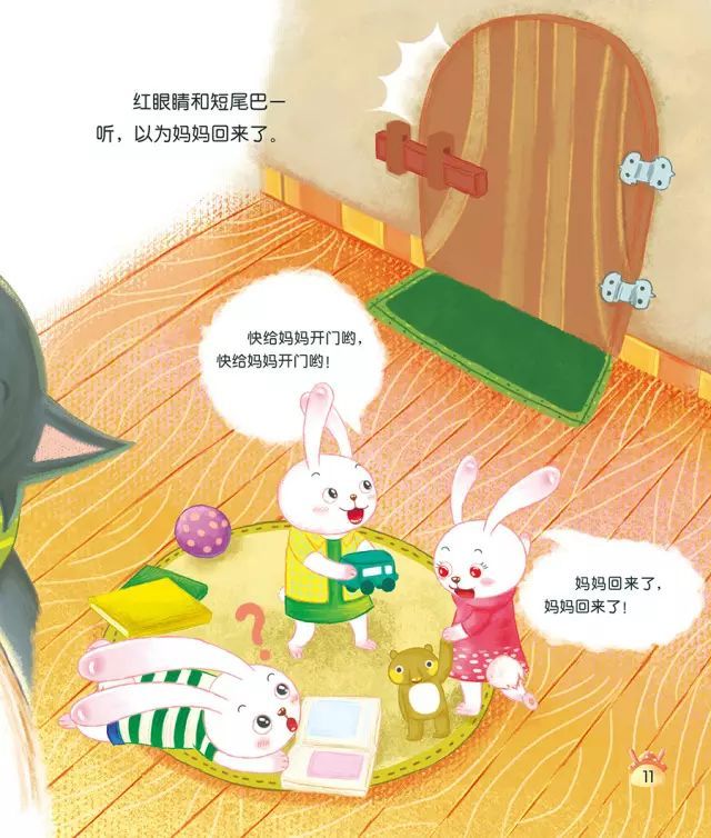 红眼睛和短尾巴一听,以为妈妈回来了。“妈妈回来了,妈妈回来了!”“快给妈妈开门呦,快给妈妈开门呦!”
