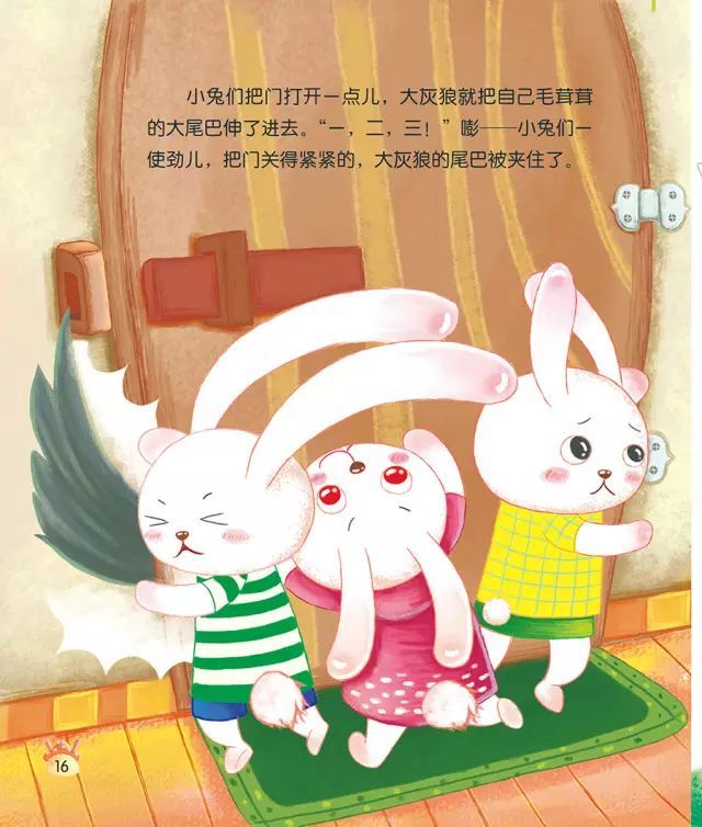 小兔们把门打开一点儿,大灰狼就把自己毛茸茸的大尾巴伸了进去。“一,二,三!”嘭——小兔们一使劲儿,把门关得紧紧的,大灰狼的尾巴被夹住了。
