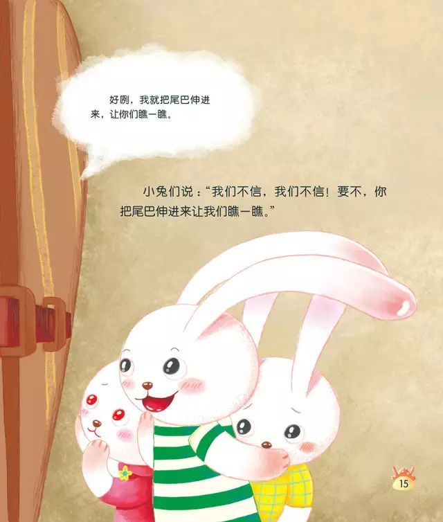 小兔们说:“我们不信,我们不信!要不,你把尾巴伸进来让我们瞧一瞧。”大灰狼说:“好咧,我就把尾巴伸进来,让你们瞧一瞧。”