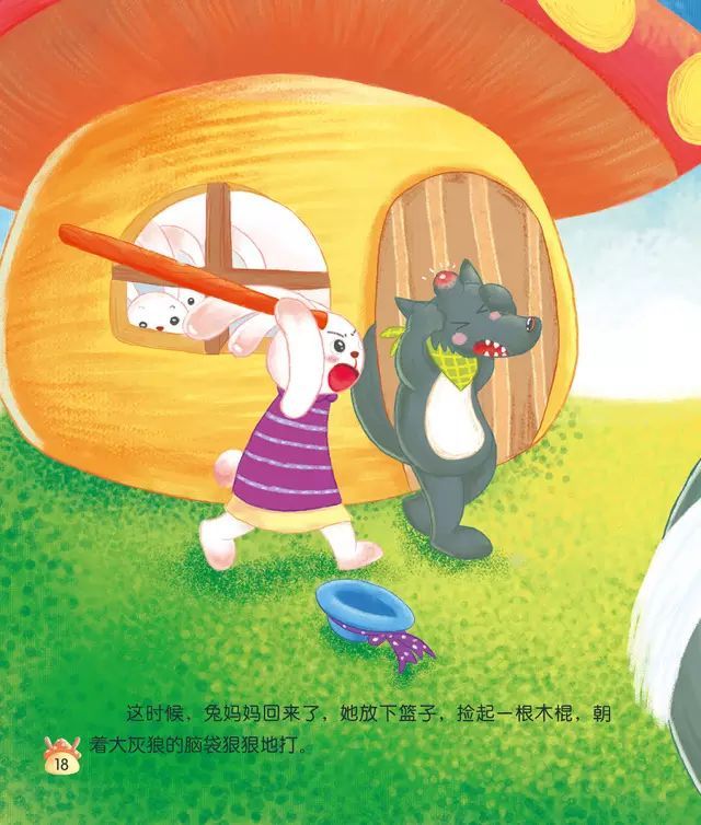 这时候,兔妈妈回来了,她放下篮子,捡起一根木棍,朝着大灰狼的脑袋狠狠地打。