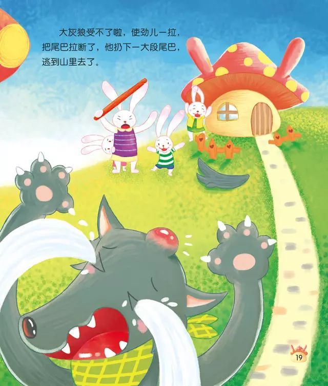 大灰狼受不了了啦,使劲儿一拉,把尾巴拉断了,他扔下一大段尾巴,逃到山里去了。