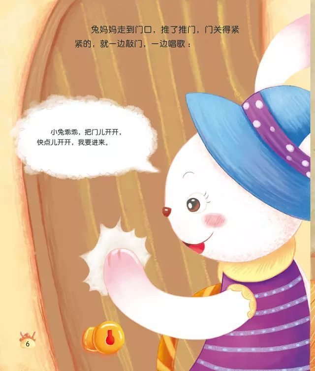 兔妈妈走到门口,推了推门,门关得紧紧得,就一边敲门一边唱歌:“小兔乖乖,把门儿开开。快点儿开开,我要进来。”