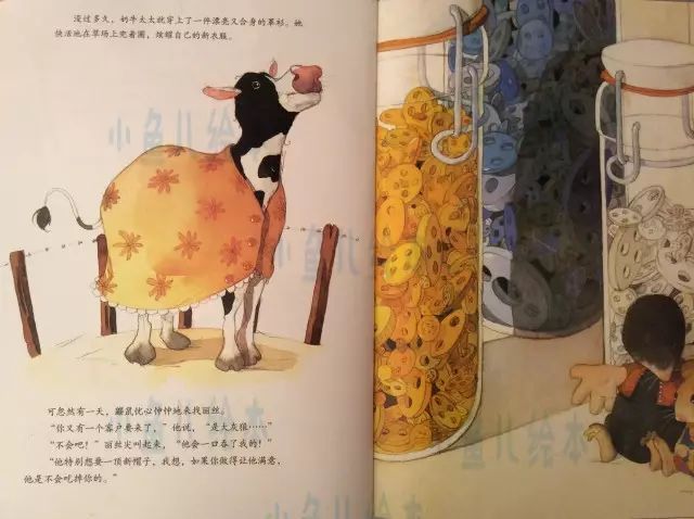 最难做的衣服是奶牛太太的。“我想要一件漂亮的长衫,还要闪闪发光的大纽扣。”奶牛太太说。