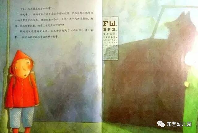 可是,几天前发生了一件事……那天早上,我站在红灯前等着过马路的时候,突然发现不远处有一辆又黑又大的汽车,里面坐着一个人。天哪!那个人阴沉着脸,好像一直在盯着我看。他看上去是多么可怕啊!那时候天还没有完全亮,我不由得想起了《小红帽》这个故事——就是妈妈讲过很多遍的那个故事。