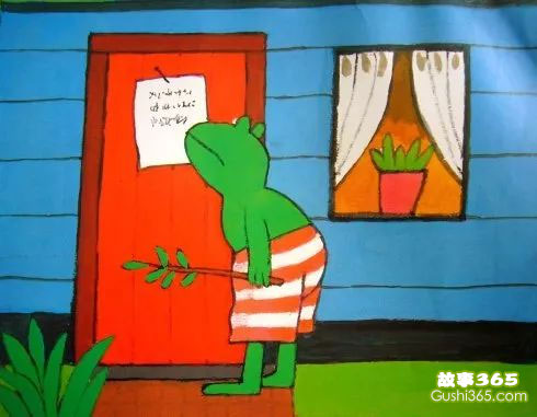 可是野兔不在家,只在门上留了一张纸条。纸条上写着有关聚会的事,弗洛格看不太懂。