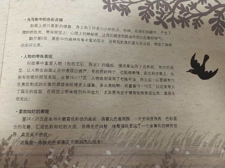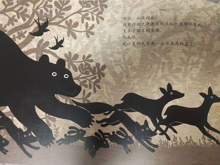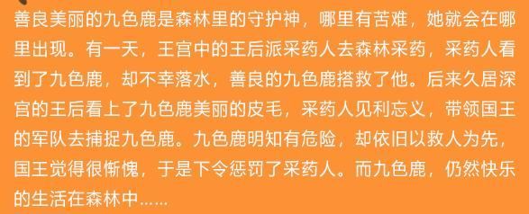 听说,从这以后,没有得到九色鹿皮的王后一直郁都寡欢,失去了国王的宠爱。 而我呢,就一直和九色鹿一起住在森林里了。