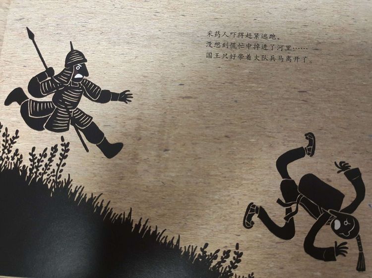 采药人吓得赶紧逃跑,没想到慌忙中掉进了河里。国王只好带着大队兵马离开了。