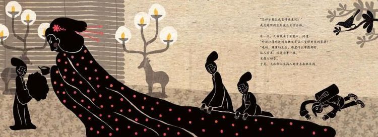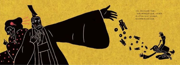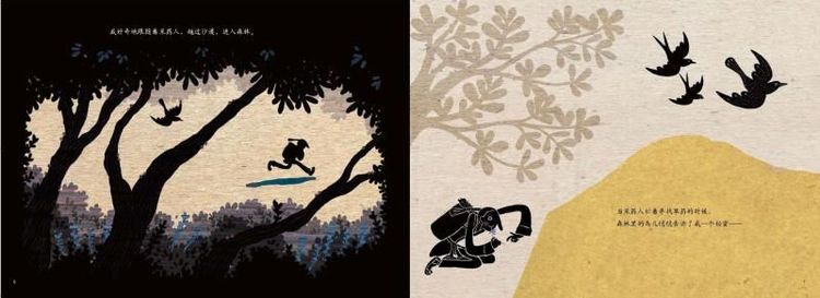 下面 我来欣赏一下故事中内容。在故事中巧妙安排了一只玄鸟(太阳鸟),扮演了散播故事种子的说故事人,让故事更顺畅更有童趣,画家在全书中让玄鸟在每个书画和主角采药人出现在不同的地方,演出了很精彩的纸上电影故事!