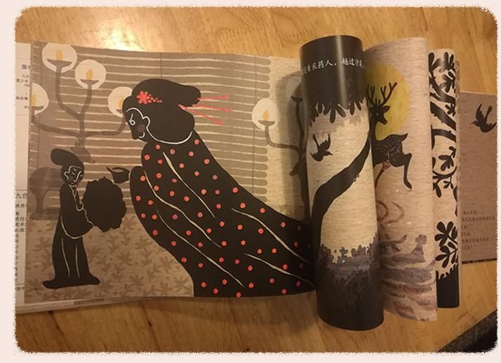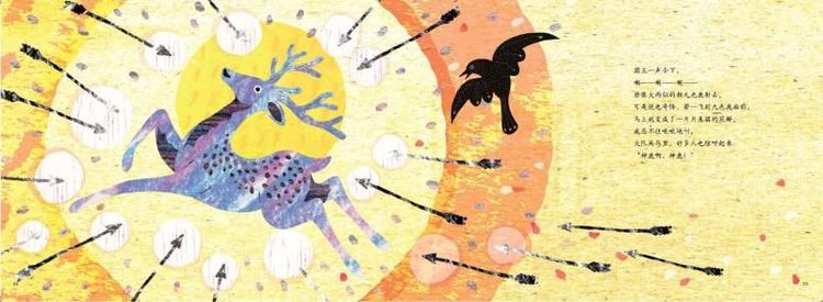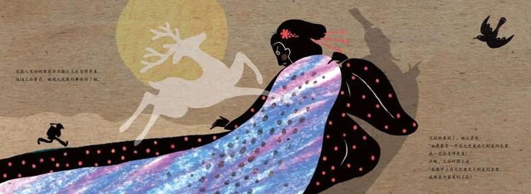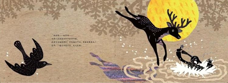 《九色鹿》的缘起追溯到2014年《东方娃娃》第412期的刊物上,“老故事”栏目刊出了一篇《九色鹿》改编的故事,也是这个因缘,才有了现在《九色鹿》图画书的诞生。随着《九色鹿》文图稿的反复修改,故事都在朝着意想不到的惊喜前进,然后一再再的修改,直到完成。说实在的,这有点像人生…… 然后,我们把话题再拉回到故事的新角色上。就这一点,讨论了许久,所有常说,图画书可不是只有两个人就能完成的,它需要一个团队。一开始,我们创作了两个版本的文稿,一个较似于以往的故事,另一个则是加入一只鸟,让鸟儿来述说整个故事。但该选择什么样子的鸟儿呢?经过几番讨论,我们最后决定让玄鸟(太阳鸟)来担起这个重任,有了这个初步决定后,文本就还算顺利地往下进行了。