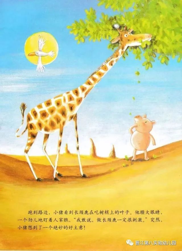 跑到路边,他看到长颈鹿在吃树梢上的叶子。他瞪大眼睛,一个劲儿地盯着人家瞧,“我敢说,做长颈鹿一定很刺激。”突然,小猪想到了一个绝妙的好主意!