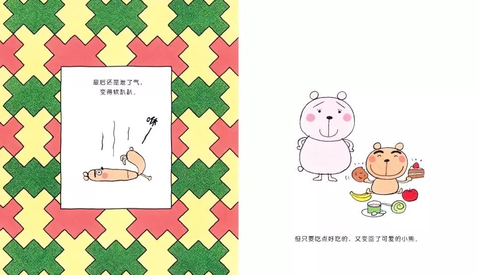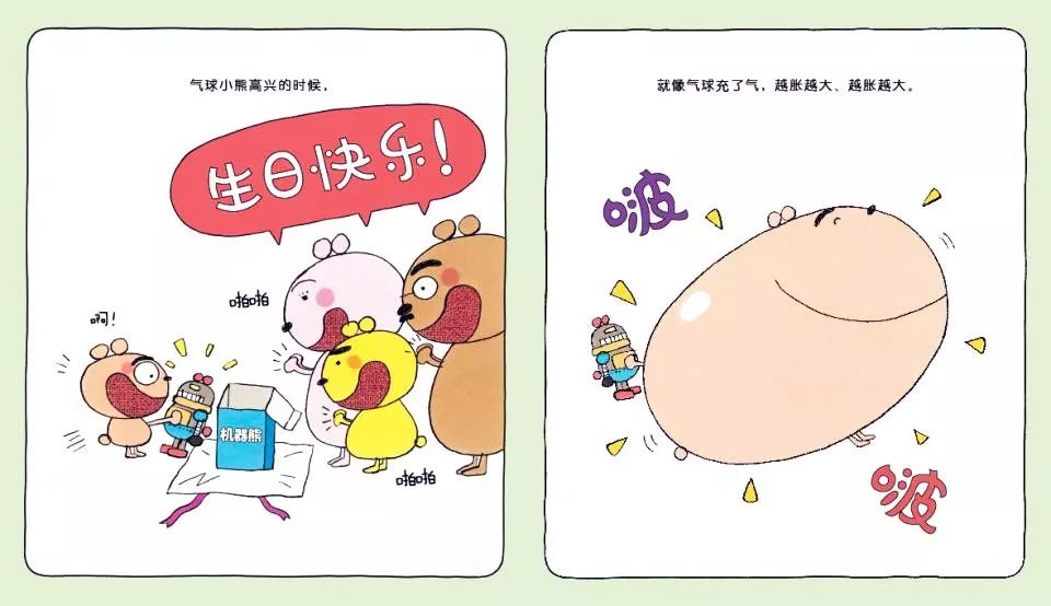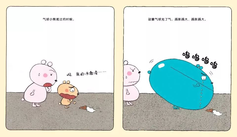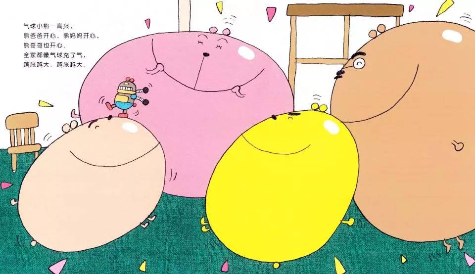 画家秋山匡的《气球小熊》给我们带来了一个充满童真和想象的故事,既看到了好玩的创意,也了解了孩子丰 富的情绪变化。书中以气球小熊为主角,借助了四四拍的节奏,分别描绘气球小熊的四种心情状态:害怕、生气、难过和开心,与之对应了四个阶段性的变化:正常 ——情绪变化——情绪释放——恢复正常。如此一来,画家非常巧妙地将小熊的情绪变化与气球的物理变化相结合,精彩、形象地描绘孩子的内心世界,是一本真正 走进孩子内心的,表达孩子真实想法的温馨可爱绘本。